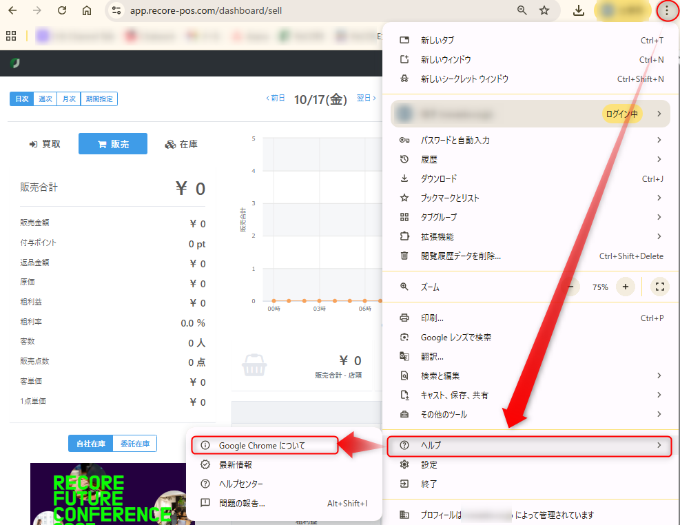 PCの再起動後に、GoogleChromeブラウザの再読み込み後、以下のRECOREログイン画面URLよりログインしてお試しのうえご確認ください。