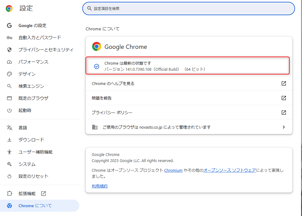 なお、GoogleChromeが最新版の場合には、『Chrome は最新の状態です』と表示されます