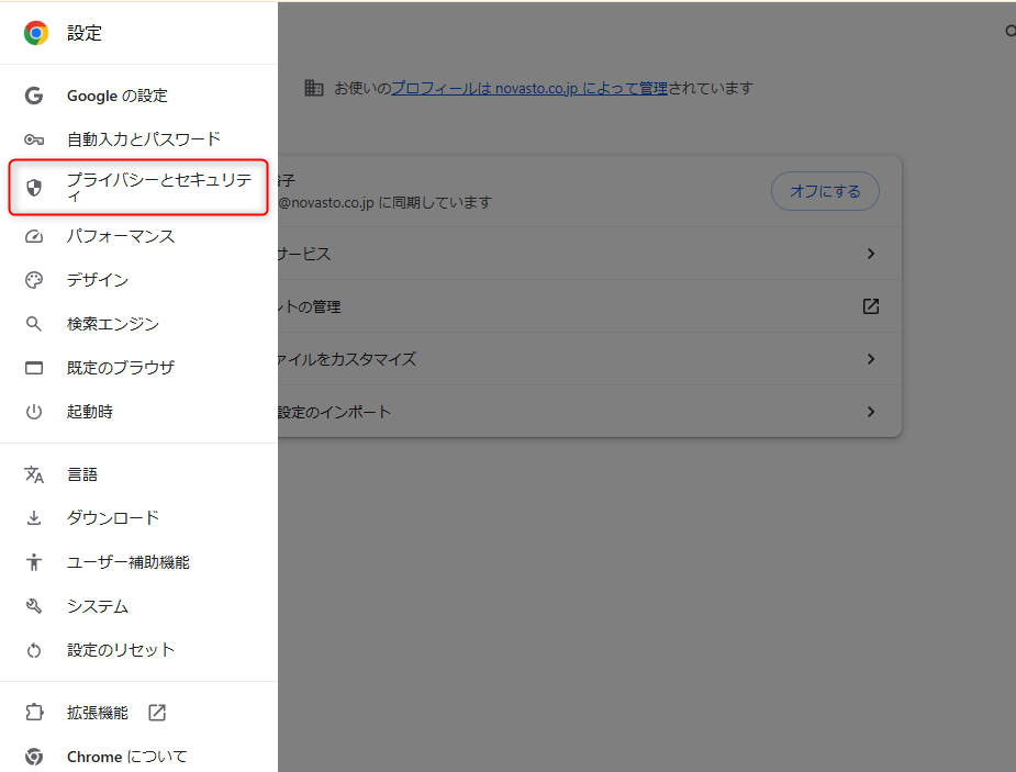 ❷【プライバシーとセキュリティ】をクリック