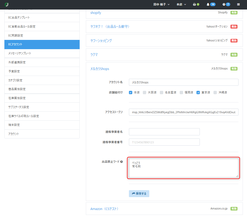 ➁各連携モールの詳細画面内にある【出品禁止ワード】欄に、NGワードを入力します。