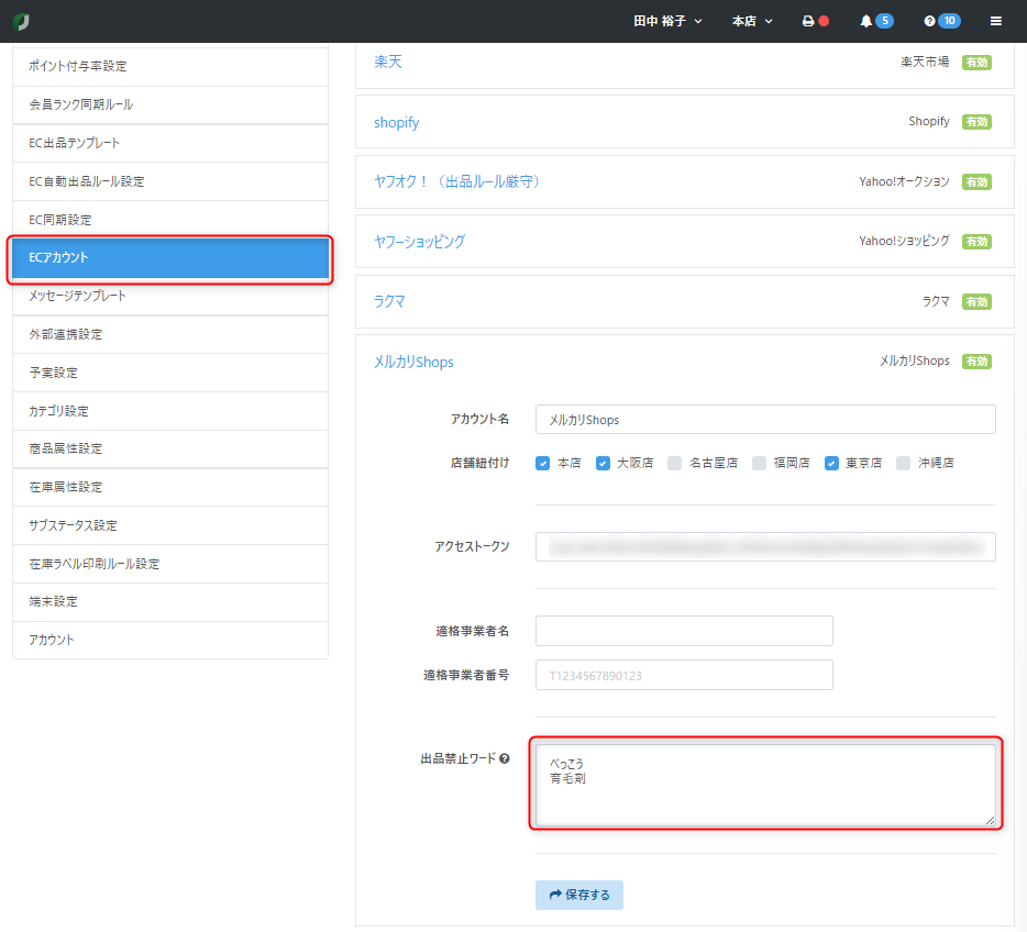 【ECアカウント】をクリック後、設定したい「各ECアカウント」をクリックのうえ、【出品禁止ワード】項目にワードを入力します。