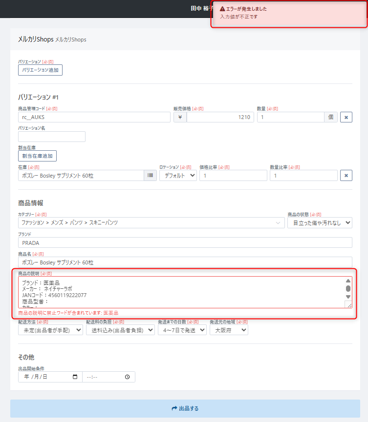 例『商品の説明に禁止ワードが含まれています。医薬品』