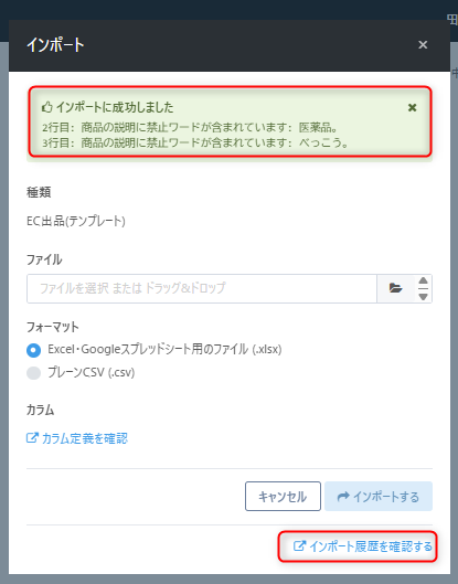 一括出品操作後にのインポート画面において、以下の画像のようにエラーメッセージが表示されます。