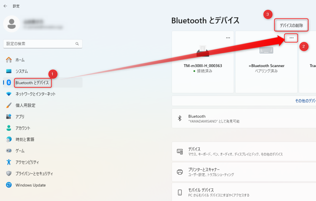 【Bluetoothとデバイス】より該当するバーコードリーダーの接続の右上にある【…】をクリックし、【切断】もしくは【デバイスの削除】をクリックします。