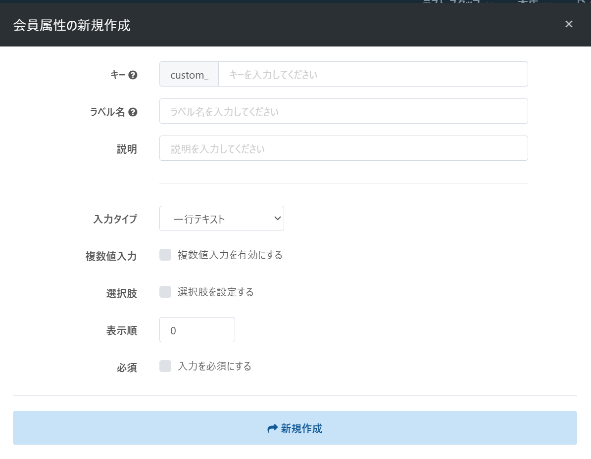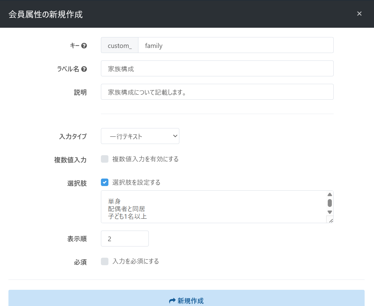2 | ラベル (必須) | 全角半角など文字で入力 | 任意の属性名を設定。会員の詳細画面に項目名として表示されます。 |