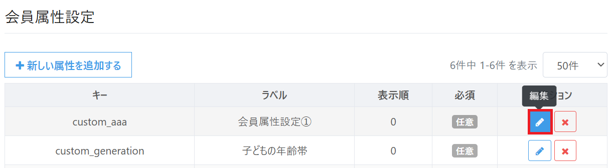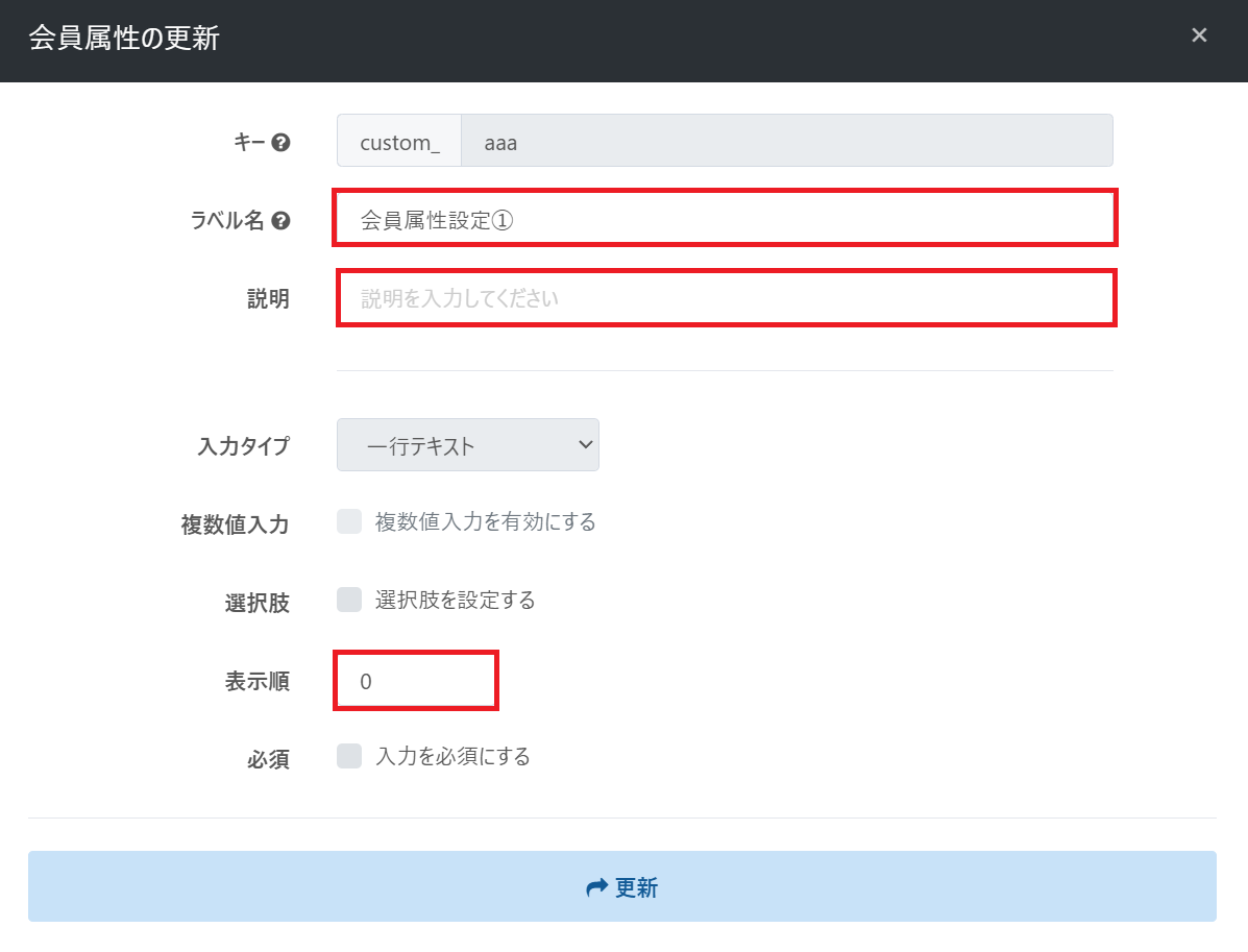 会員属性の更新は「ラベル名」「説明」「表示順」のみ更新が可能です。