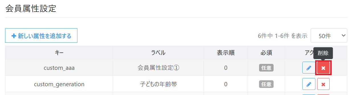 削除を行う場合、属性を利用している会員がいない状態にする必要があります。