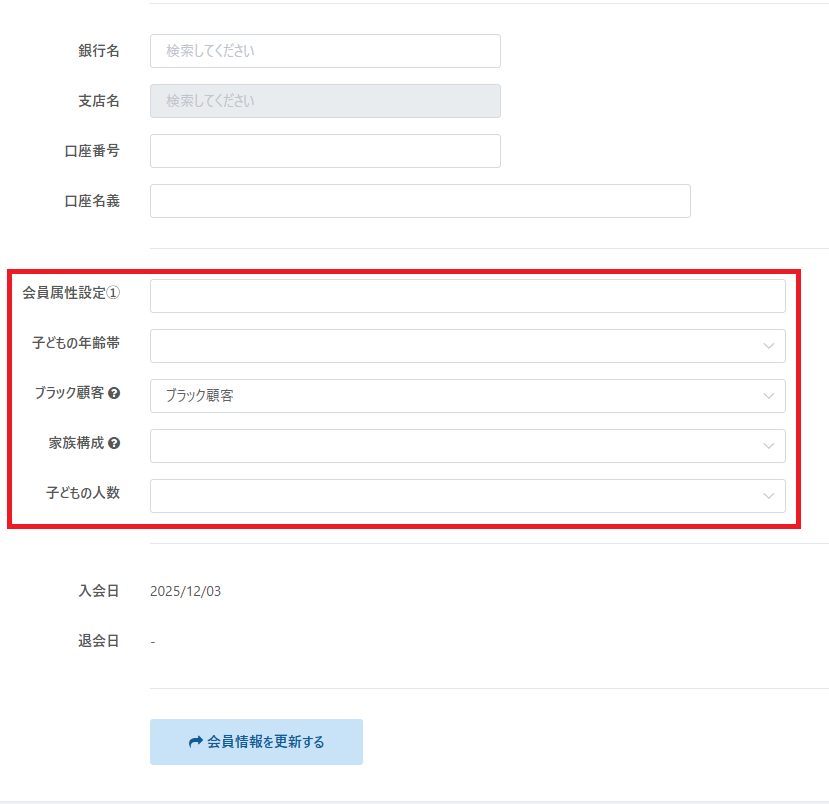 設定した会員属性は会員の詳細画面と詳細検索に表示されます。