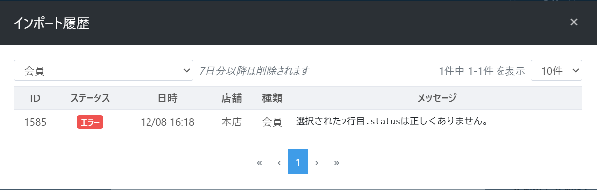 エラーの場合はステータスが「エラー」となりますので、「メッセージ」に表示されている内容に沿ってファイルへの記載内容を修正してください。