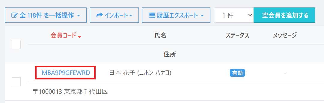 会員コードは【会員リスト】画面に表示されているMBから始まる英数字羅列のコードになります。