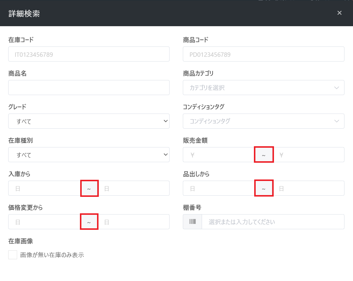 今回のリリースにより、各メニューの【詳細検索】における期間や日付の範囲を指定する際の記号を「>」から「~」へ変更いたしました。
