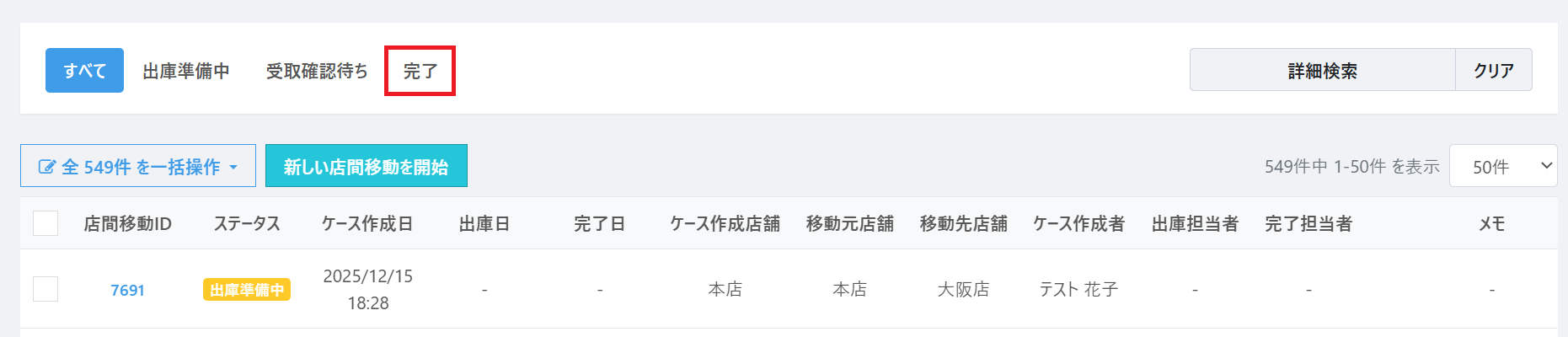 これまで「完了」ステータスの店間移動ケースは、「すべて」ステータスのタブから確認する必要がありましたが、本対応により「完了」ステータスの店間移動ケースのみを絞り込んで確認できるようになりました。