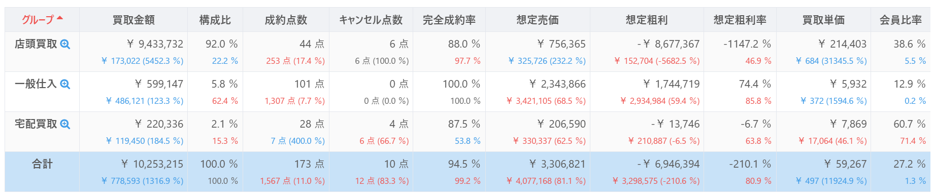 各買取金額・売上金額における数値の比較分析が容易になります。
