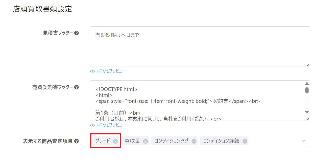 【設定】メニューの【店舗別設定】に各書類設定内にある【表示する商品査定項目】において、新たに『グレード』を選択できるようになりました。