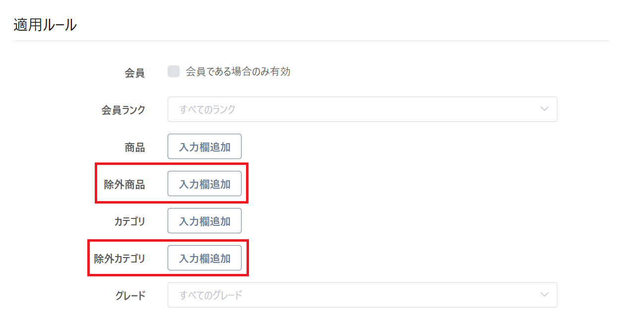 クーポンの適用ルールにおいて、対象より除外する「商品」および「カテゴリ」を設定できる機能を追加しました。
