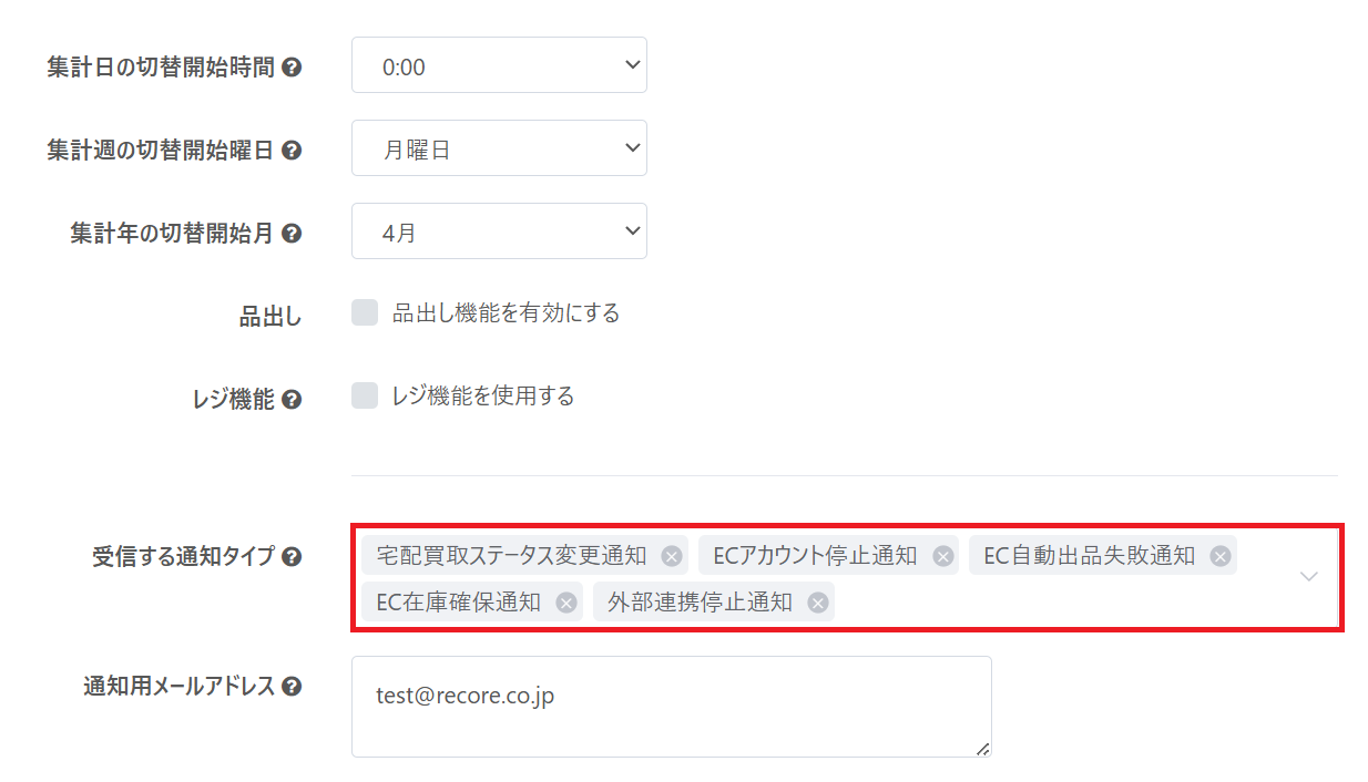 本機能により、「EC在庫確保通知は受信しない」といった個別の設定が可能となります。通知の指定は店舗単位で設定が可能です。