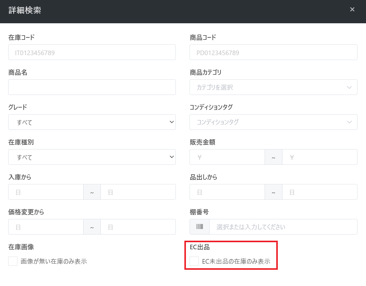 今回のリリースにより、【在庫リスト】画面の【詳細検索】から『EC未出品』の在庫を検索できる機能を追加しました。
