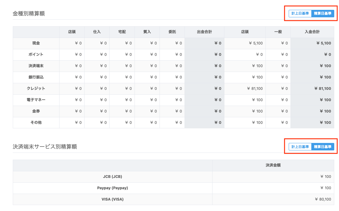 また、今回のリリースに伴い、【経理レポート】画面から出力できる対象レポートには、「金種別生産額」と「決済端末内訳」に対して、「計上日基準」と「精算日基準」を追加します。
