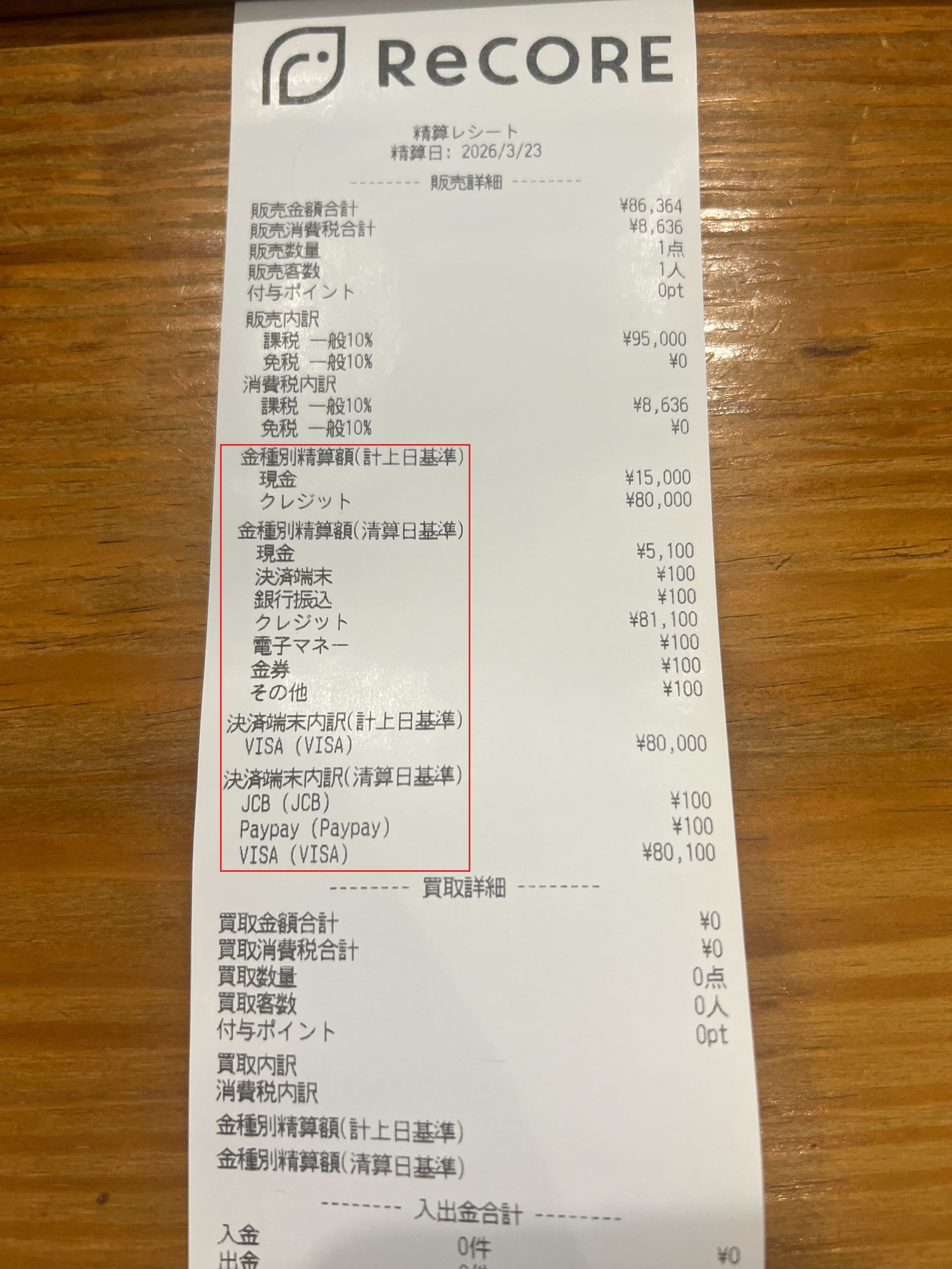 金種別精算額(計上日基準):0円