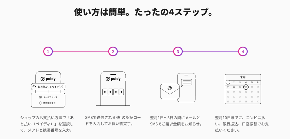 ご注文完了後、Paidy(ペイディ)ログイン画面より操作いただき、上記のうちご希望の方法にて、お支払いを完了していただく流れとなります。