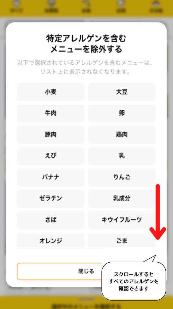 該当のアレルゲンを含むメニューが、メニュー選択リストに表示されなくなります。