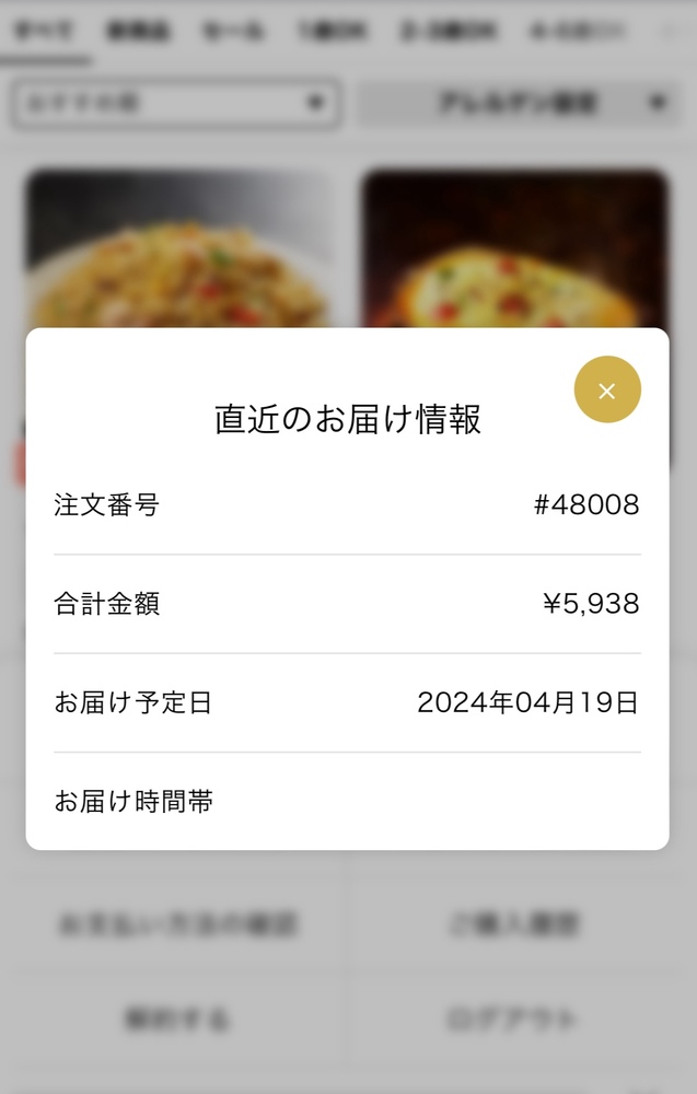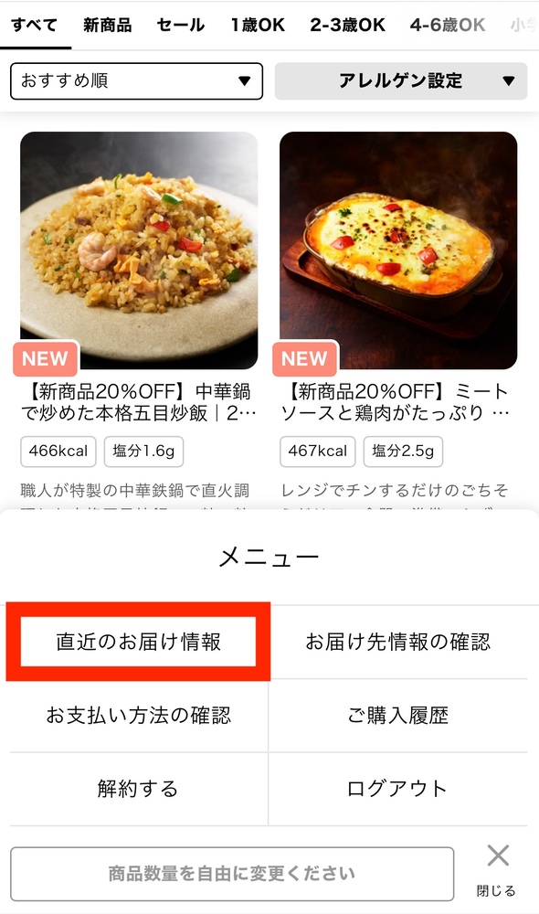 マイページから、メニュー > 直近のお届け情報 に進んでいただきますと、