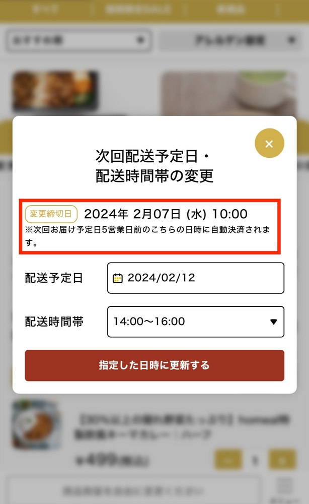 次回ご注文内容を確認する > 予定日の変更 > 変更締切日 より、ご確認ください。