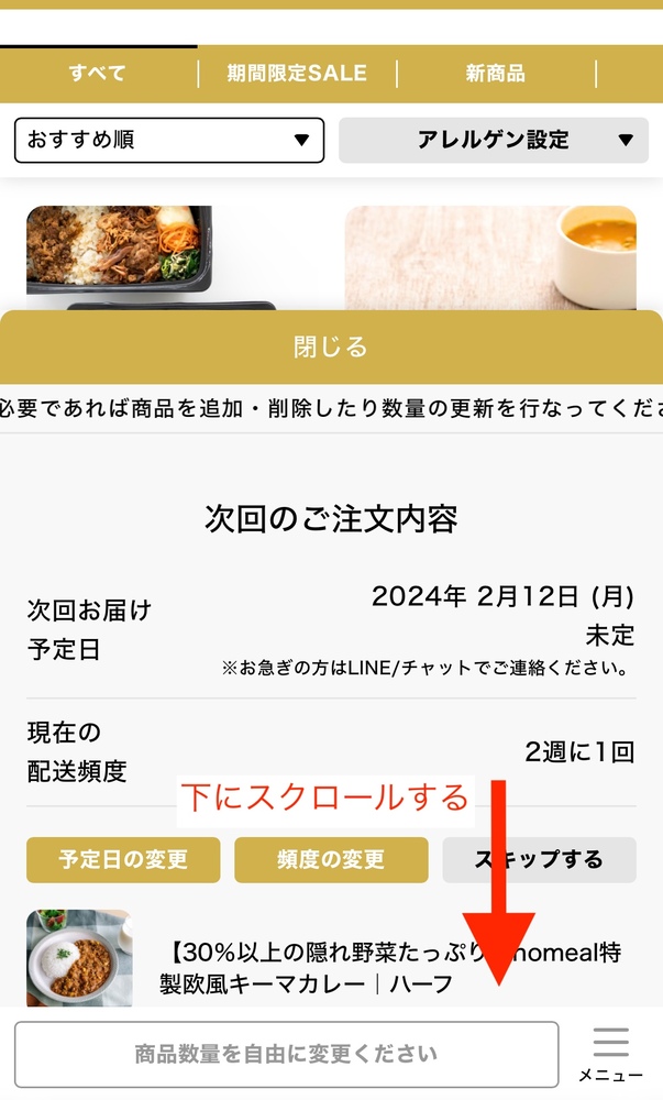 ② ログインすると「次回ご注文情報を確認する」より「予定日」「頻度」「メニュー」の変更ができます。