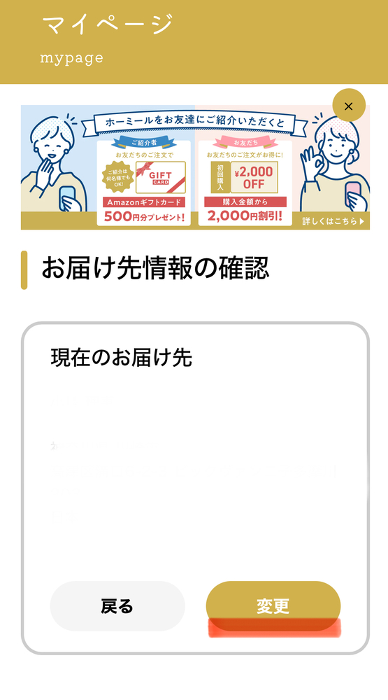 ②メニュー詳細の「お届け先情報の確認」から変更