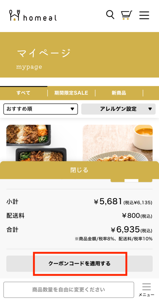マイページにログイン後、以下の手順でクーポンコードを登録いただけます。
