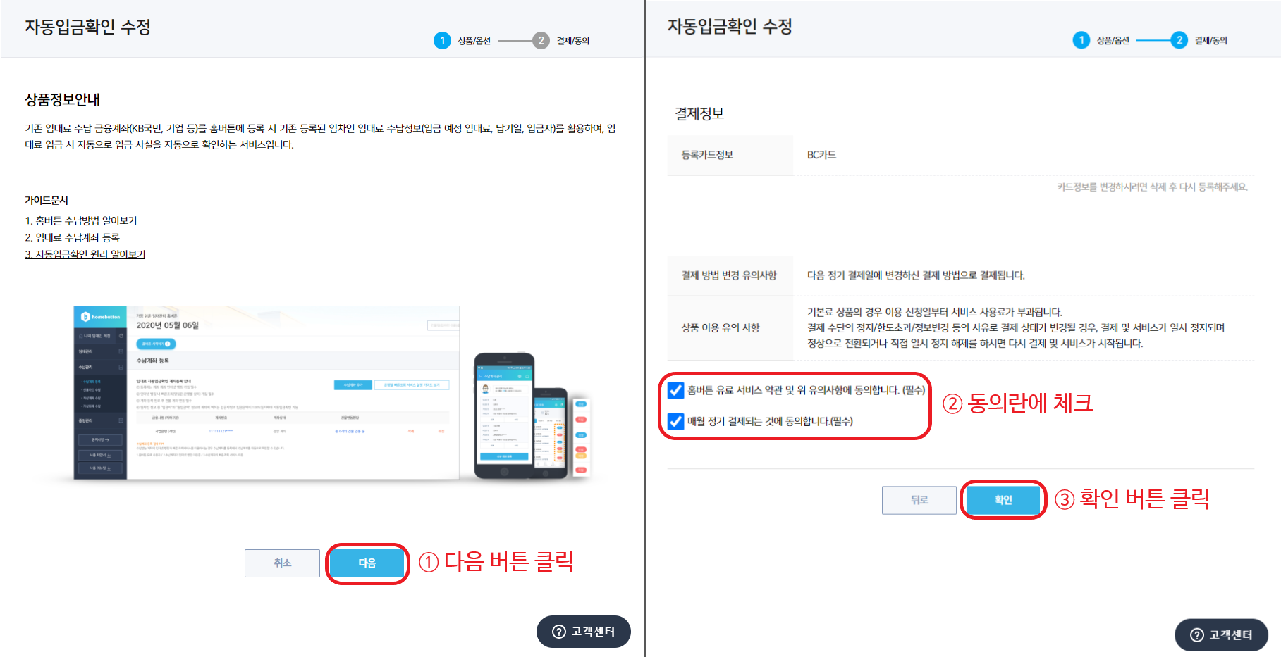 2. 위 그림의 ①→②→③번 순서대로 진행하여 자동입금확인 서비스를 신청합니다.