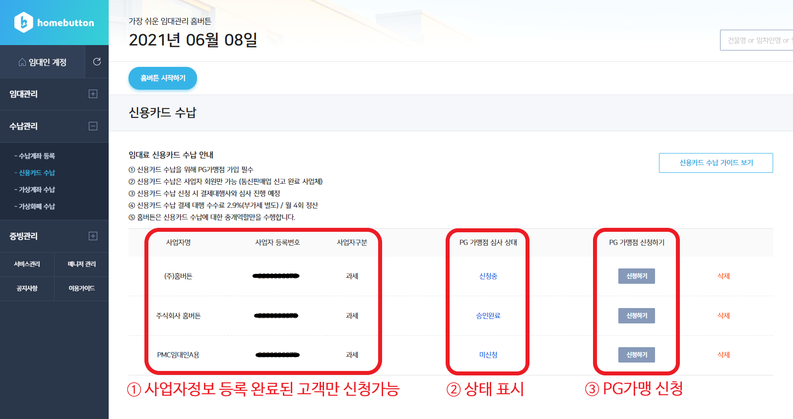 3. 위 그림의 ①번과 같이 사업자정보가 등록되어 있다면, ③번 신청하기 버튼을 클릭하여 PG가맹을 신청합니다. (카카오톡채널 '임대관리 홈버튼'을 통해 PG신청에 대한 알림톡이 발송됩니다.)