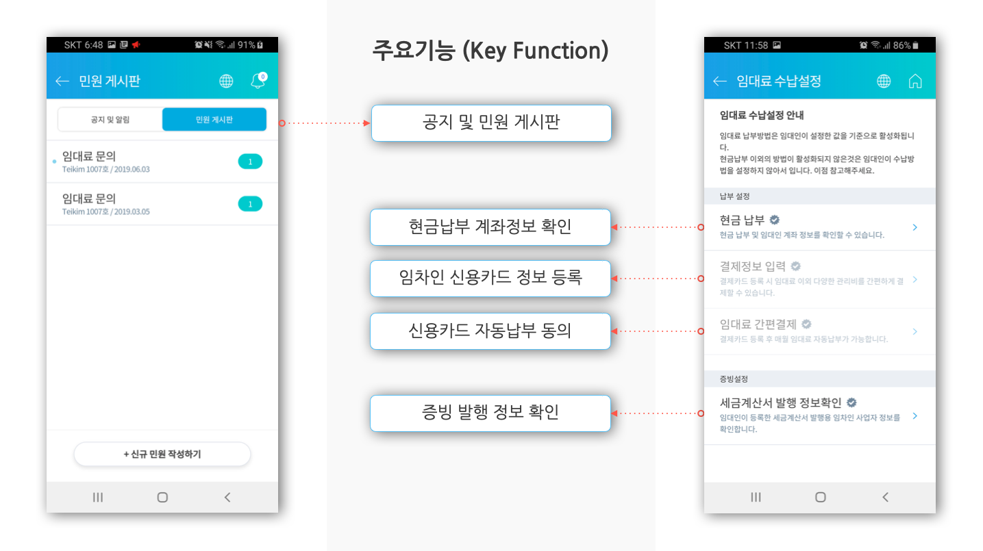 이를 통해 납부내역, 공지사항 등을 임차인과 실시간 임대차 정보를 공유할 수 있습니다.