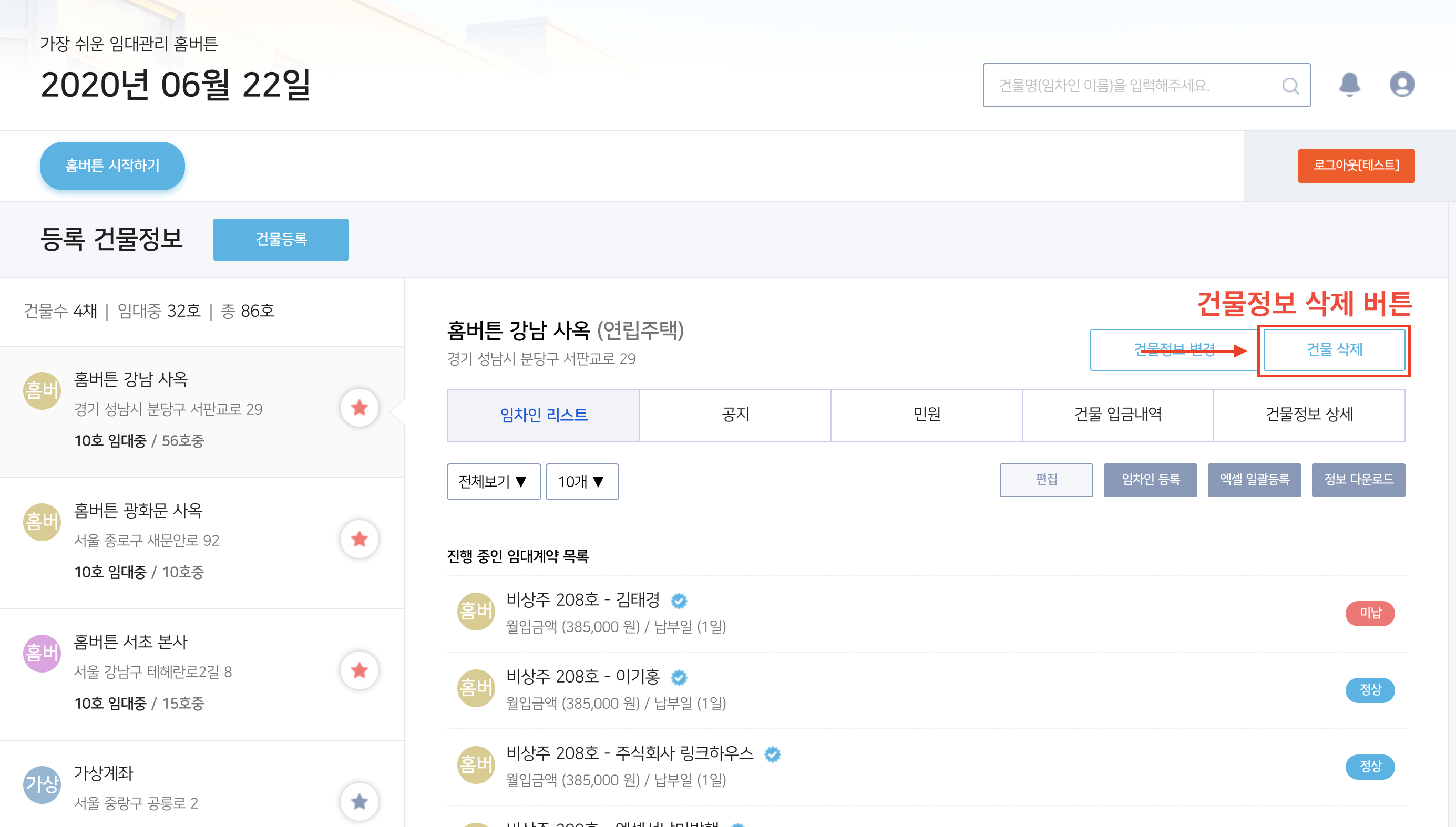 임대차 계약이 진행중인 임차인이 포함된 건물정보 삭제는 해당 계약건을 삭제하거나, 계약을 종료로 상태값이 변경되어야 삭제가 가능합니다.