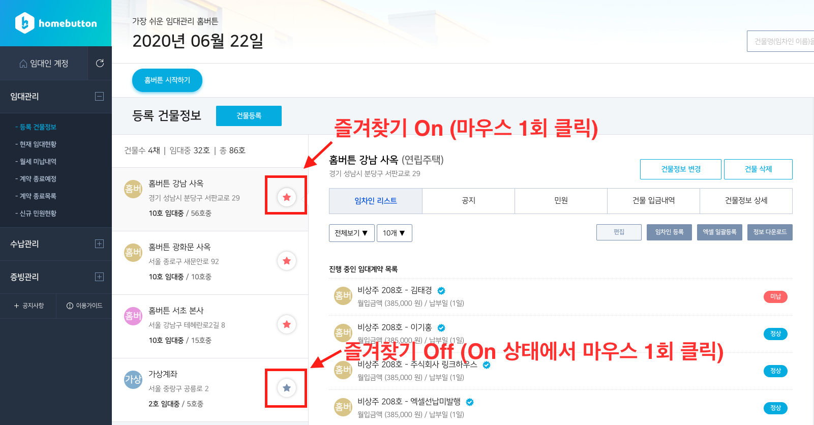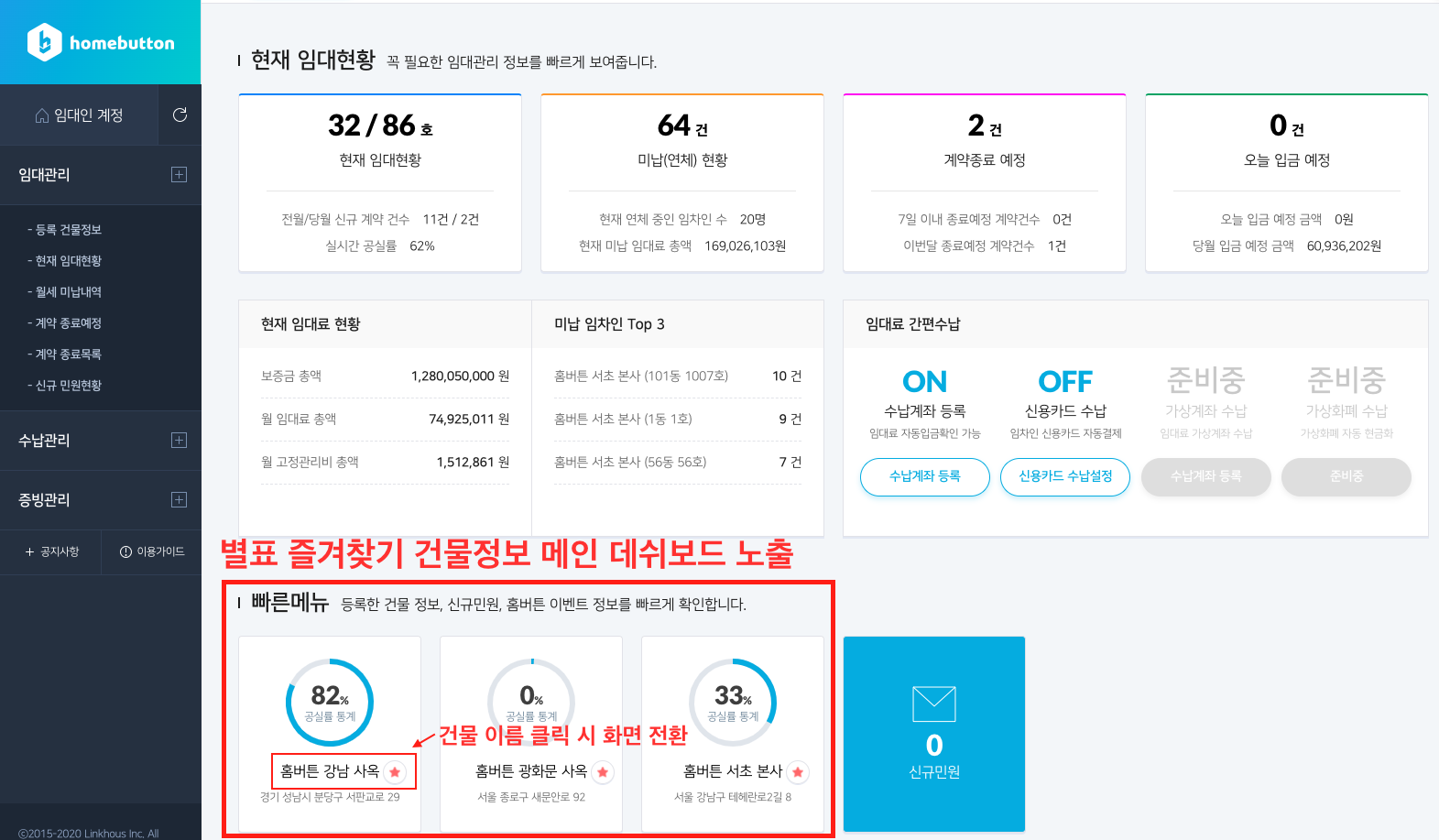 핵심 포인트메인 데쉬보드에서 건물정보를 쉽게 접속할 수 있도록 즐겨찾기를 설정할 수 있습니다. 건물정보 즐겨찾기 설정 시 건물 리스트 상단에 위치합니다. 즐겨찾기 설정등록 완료된 건물정보 리스트 끝 별표 클릭 시 건물 즐겨찾기 설정 완료별표 2회 클릭 시 건물 즐겨찾기 설정 해제 메인 데쉬보드건물정보 즐겨찾기 On일 경우 메인페이지 건물정보 노출
