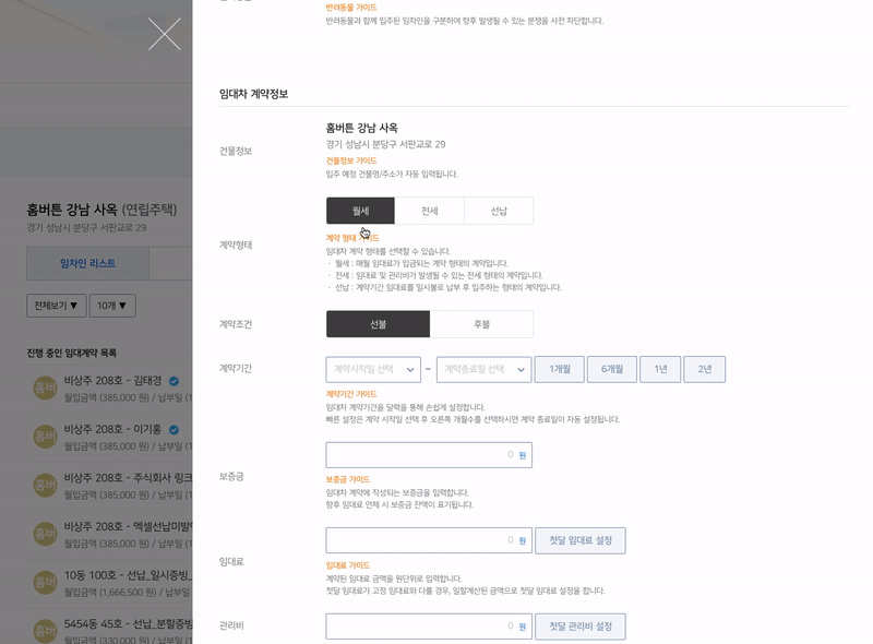 전세 : 일반 전세 계약형태를 의미하며, 별도 관리비가 존재 시 [임대료 0원 / 관리비 5만원] 등 직접 관리비를 작성 후 전세 계약을 관리할 수 있습니다.