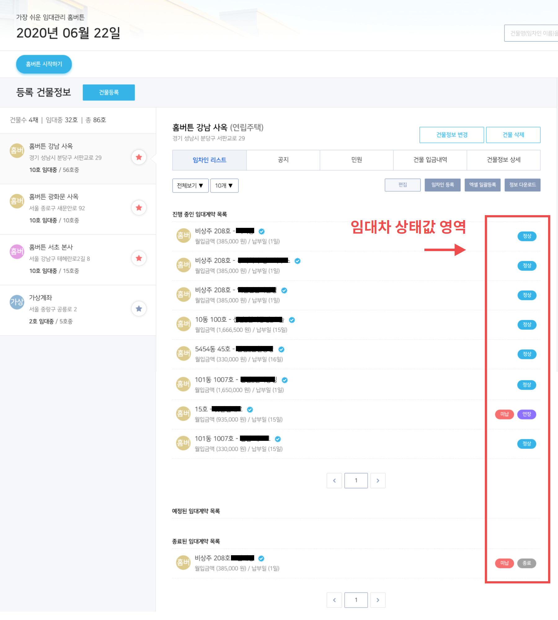 임차인의 임대차 계약 현황을 상태값을 통해 실시간 확인할 수 있습니다.