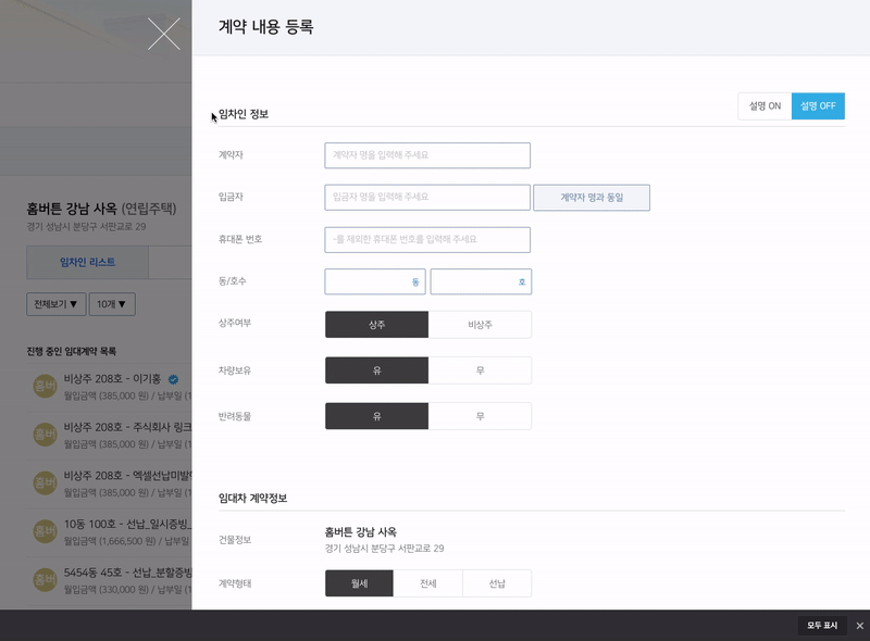 부가정보 : 임차인 초대, 블록체인 데이터 저장 등에 대한 정보를 설정할 수 있습니다.