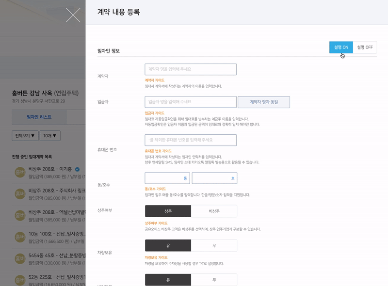 임차인 정보 : 계약자 이름, 입금자 이름, 휴대폰 번호 등을 입력합니다.