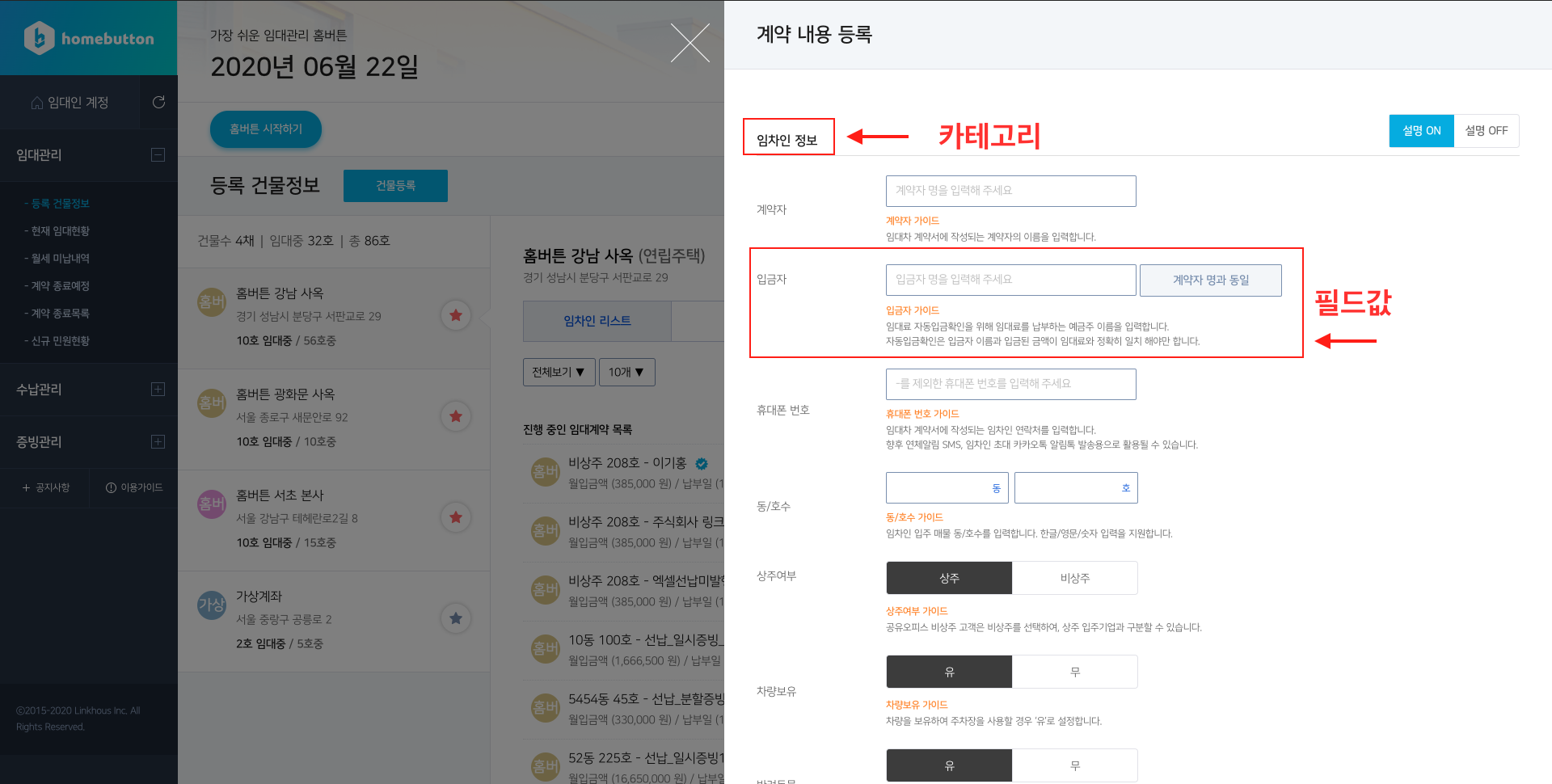 홈버튼 임차인 정보 등록은 총 5개의 카테고리로 구성되어있습니다.