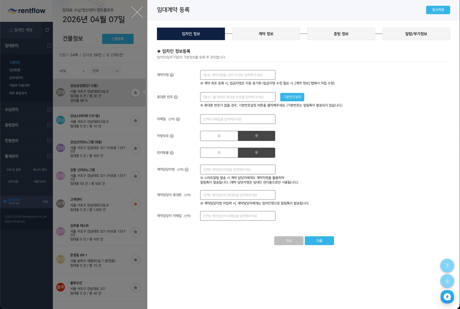 "임차인 정보" : 계약자 이름, 입금자 이름, 휴대폰 번호 등을 입력합니다.