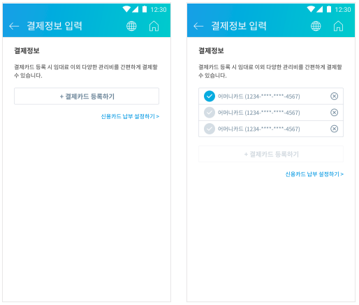 임차인이 임대료를 신용카드로 납부하기 위해서는 임차인 초대 후 임차인이 앱을 설치한 이후 가능합니다. (임차인 초대 자세히 보기)