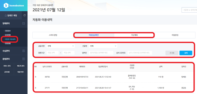 3. [임대관리]→[자동화 이용내역]→[자동입금확인] or [가상계좌]