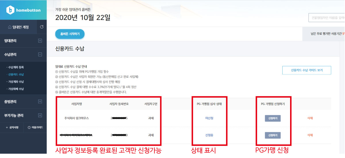 신용카드 수납을 신청합니다. (임대관리 홈버튼을 통해 PG신청에 대한 알림톡이 발송됩니다.)