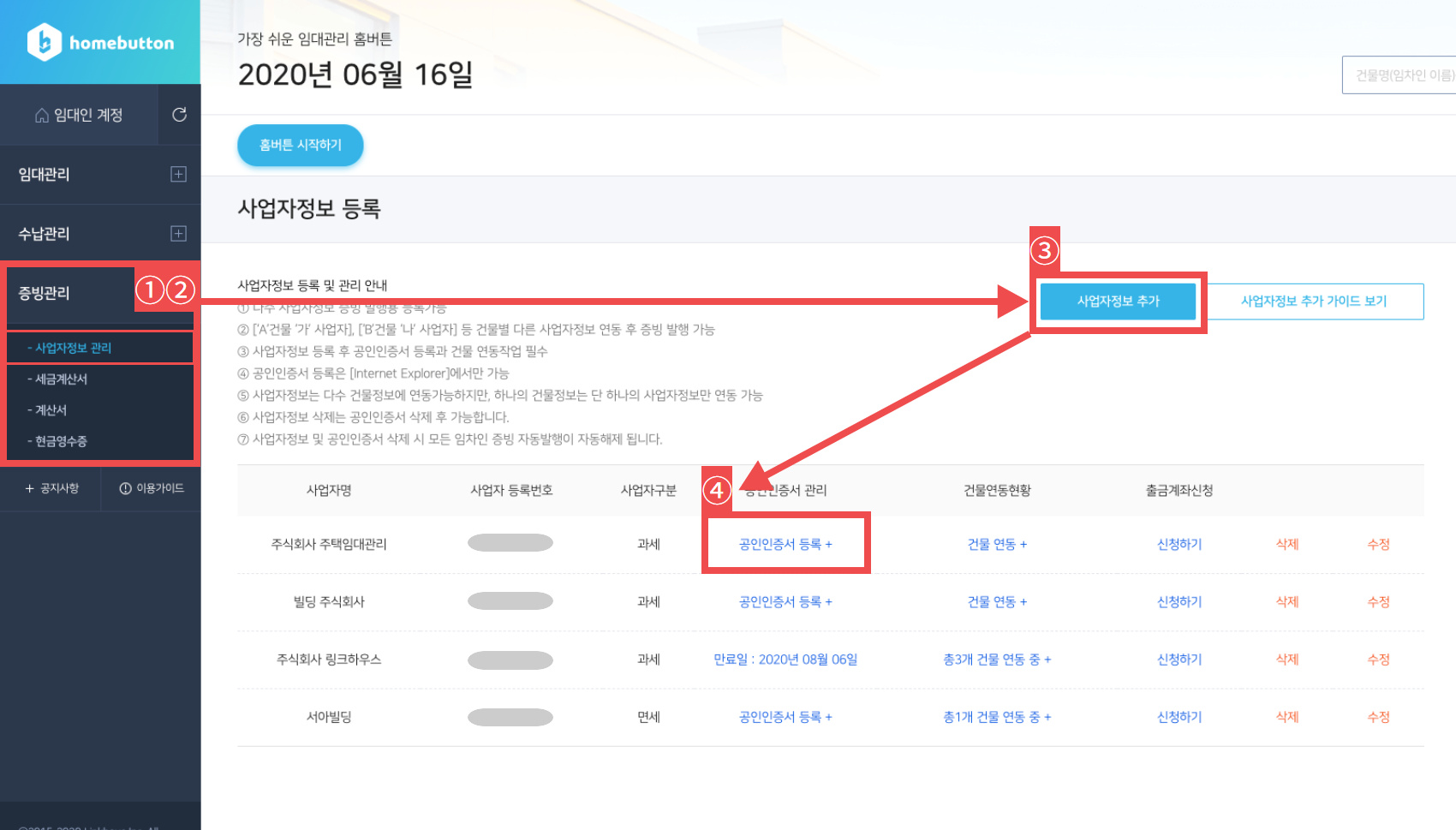 증빙 자동발행을 위해 임대인의 '사업자 정보 등록'과 '공인인증서 등록'이 필요합니다.