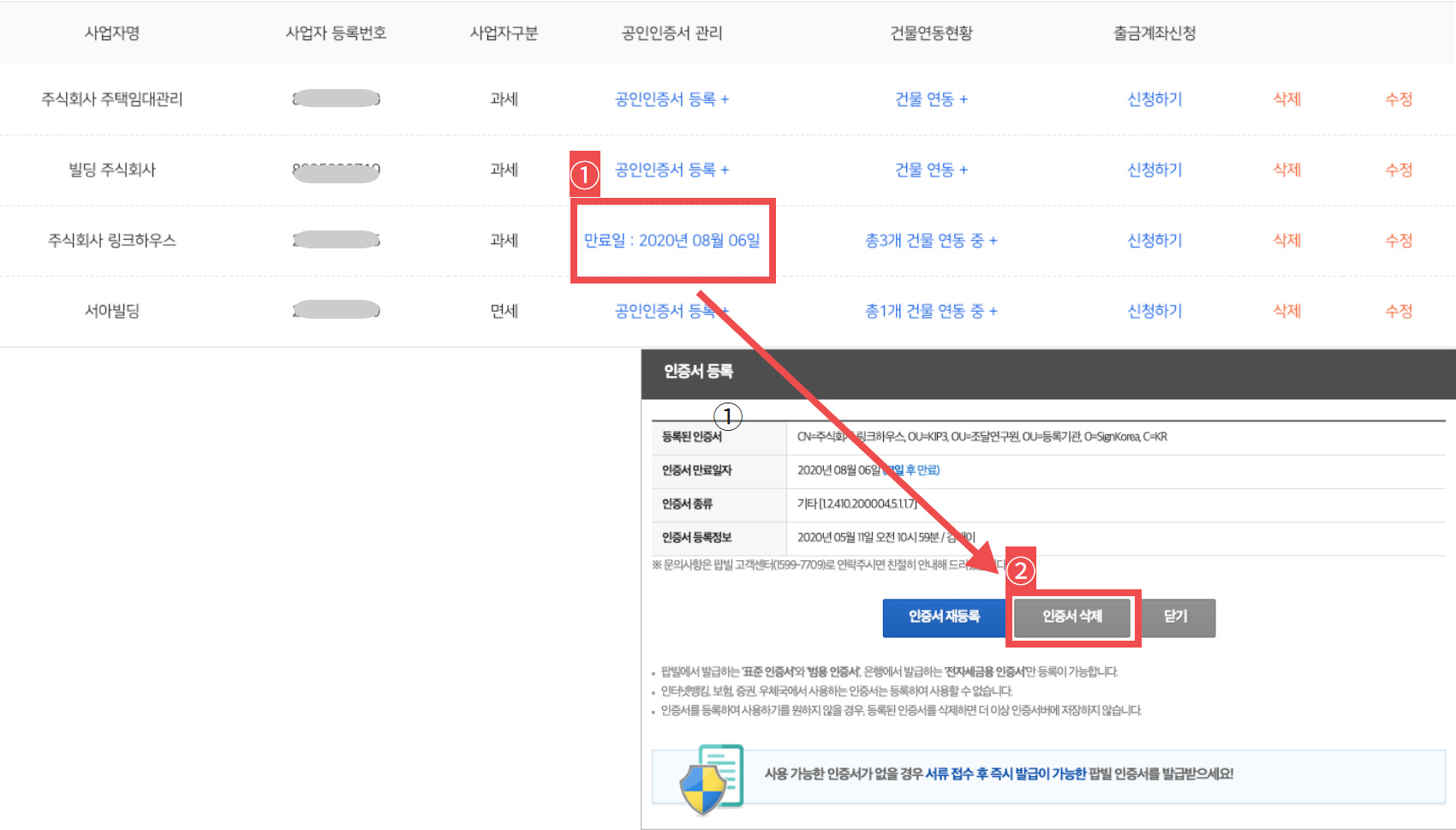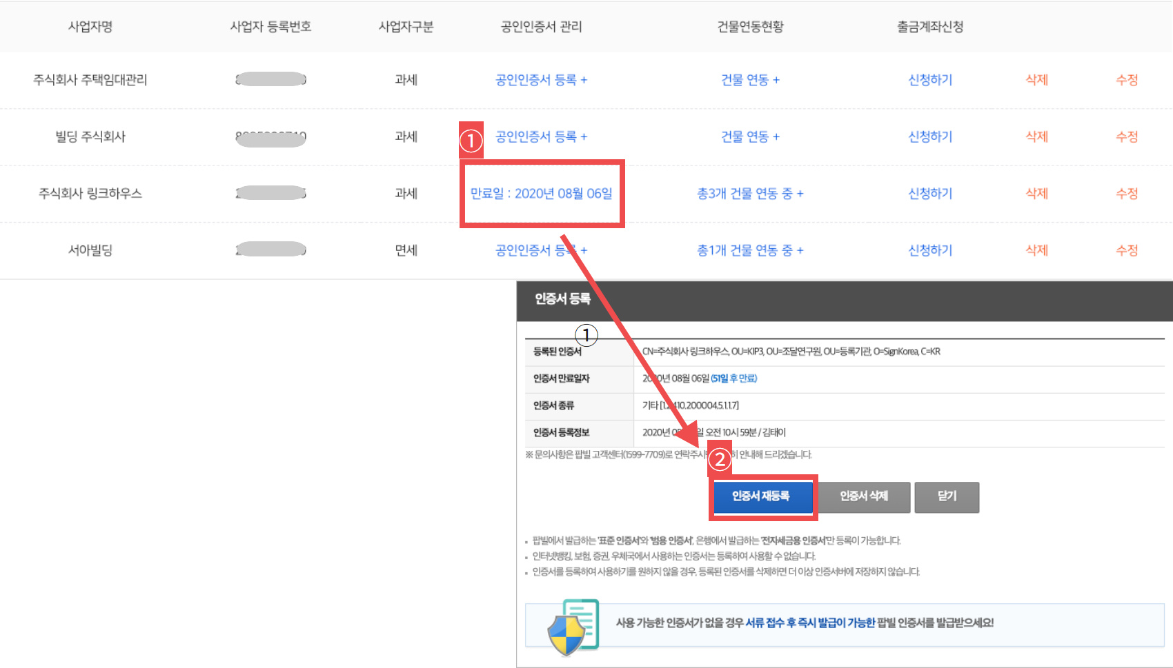 공인인증서 등록 : 등록된 사업자 정보 리스트에 [공인인증서 등록 버튼]을 클릭합니다.