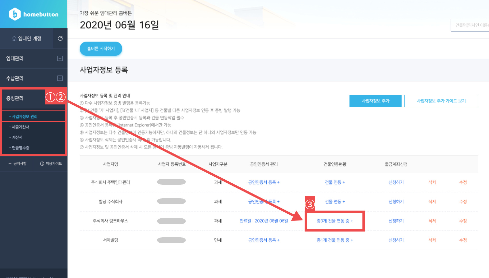 증빙 발행을 위한 '건물정보 연동이 반드시 필요'합니다.