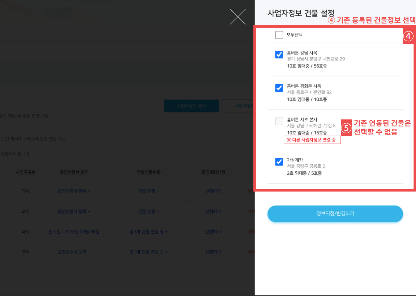 증빙 발행을 위해 사업자정보에 건물정보를 반드시 연동해야합니다.