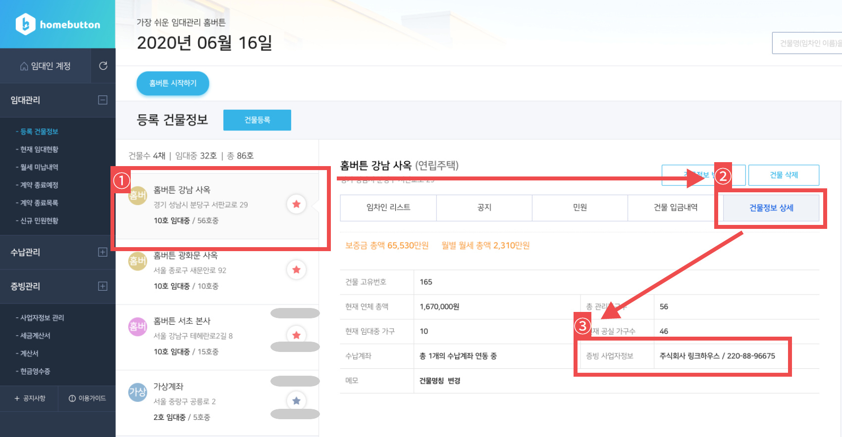 건물정보 확인 : 건물정보 상세페이지에서 해당 건물에 연동되어있는 사업자 정보를 확인할 수 있습니다.