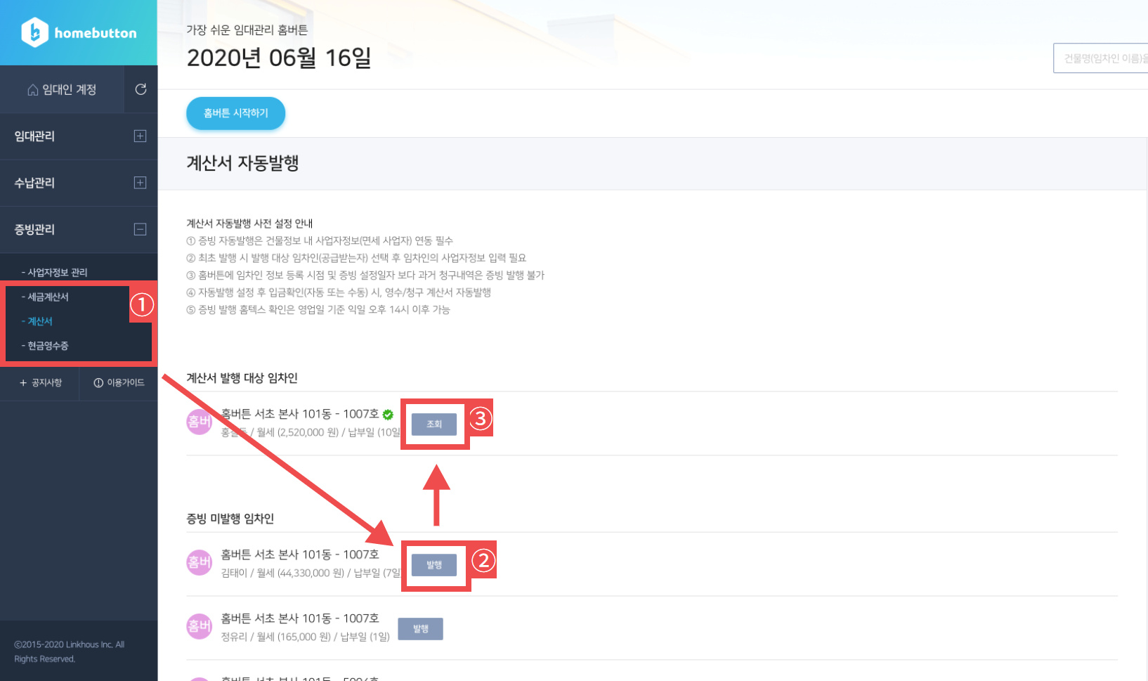 홈버튼에서는 과거 미납내역 수동입금확인, 정상 임대료 수납 후 증빙발행은 증빙 설정일자보다 과거의 내역은 증빙을 발행할 수 있습니다.